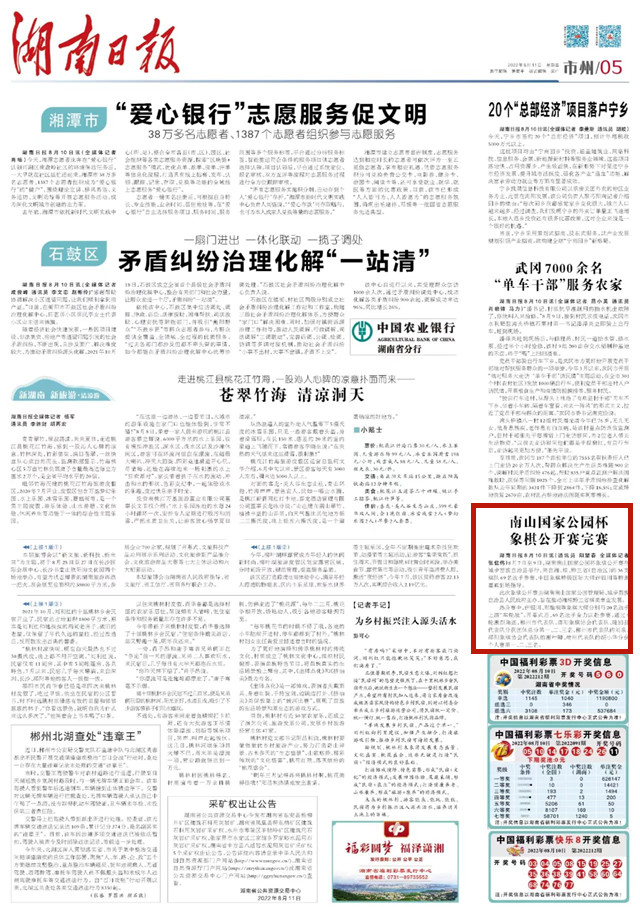 湖南日报8月10日讯(通讯员 阳望春 肖天喜 戴龙柱 全媒体记者 张佳伟)8月7日至9日,湖南南山国家公园杯象棋公开赛在城步苗族自治县举行,来自湘、桂、黔三省(自治区)的16支棋队69名选手参赛,中国象棋特级国际大师许银川等特邀嘉宾到场指导。