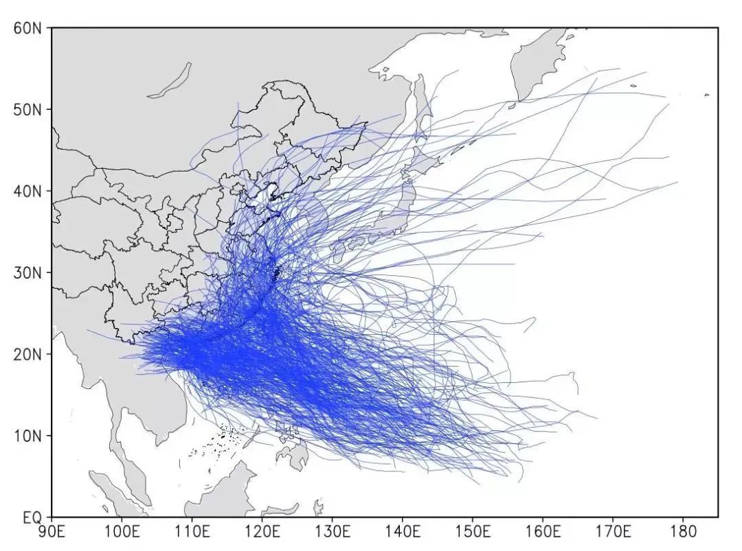 图为1949年以来登陆我国台风的路径图