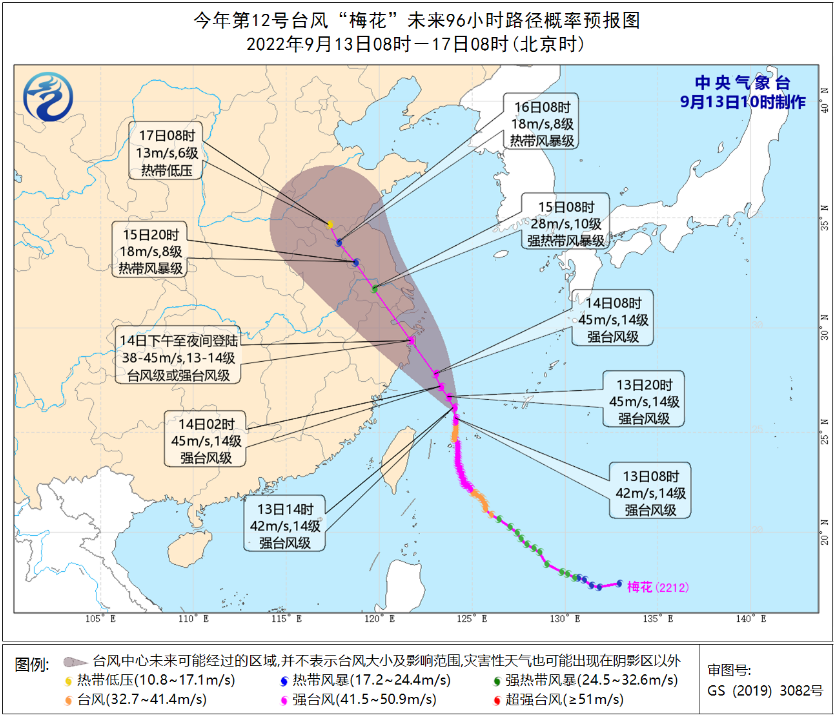 根据预测,今年第12号台风“梅花”有极大可能于14日下午在浙江宁波附近沿海地区登陆,登陆时的强度会在强台风或者台风的上线,随后影响整个包邮区以及安徽、山东等省份、甚至连辽宁都有可能受到波及。