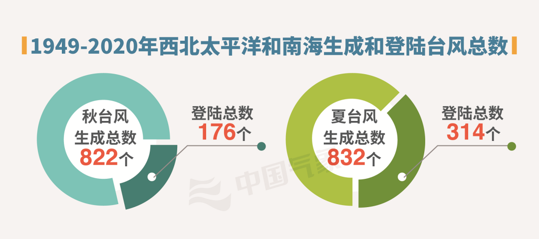 首先,关于秋台风气象上并没有严格的定义。一般将6月至8月生成的台风称为夏台风,9月至11月生成的台风称为秋台风。从下图可以看出,秋台风和夏台风在生成总数上“打成平手”,但在登陆数量上,夏台风则遥遥领先,如果以此以为夏台风比较强的话就错了。