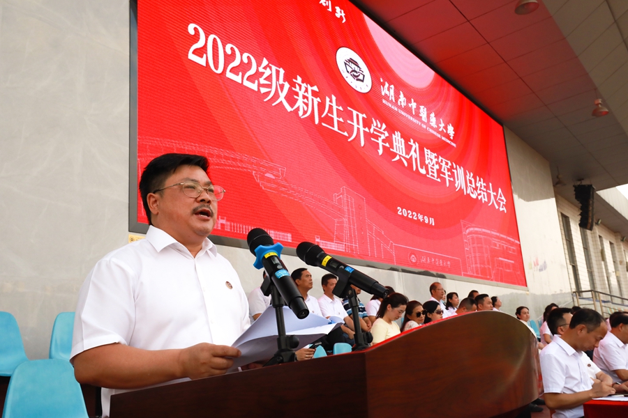 新湖南客户端9月17日讯(通讯员 肖宇利 宁思思 摄影 刘伊婷 唐金凤 )9月16日下午,湖南中医药大学2022级新生开学典礼暨军训总结大会在含浦校区举行。全体在家校领导,国医大师熊继柏,省军区战备建设局后备力量组组长、学生军训办公室主任汤光强,长沙市岳麓区委常委、区人武部政治委员伍少林等参会。大会由副校长廖菁主持。