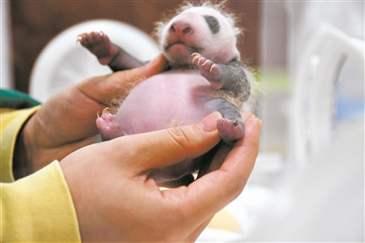 短暂喜悦之后,我们很快发现和大多数初生幼仔不同的是,“怡然仔”没有尖锐高亢的叫声,也没有“新生儿”拼尽力气的挣扎状,给人感觉活力差、叫声弱,目测体重80克左右,属于体型偏小、体重偏轻的熊猫宝宝。仔细体检后更是发现,它的两个后脚掌都只有4个脚趾,比正常后掌脚趾各缺失一个。这种情况极为少见,这是一只先天发育异常的熊猫宝宝。根据以往数据统计,先天发育异常的熊猫宝宝存活率极低……