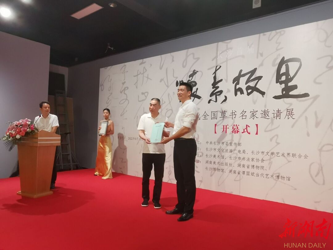 怀素是中国书法史上的一座高峰,其草书艺术与张旭齐名,并称“颠张醉素”,对后世影响深远。怀素《自叙帖》开篇之句“怀素家长沙”,点明了长沙是怀素的故乡。为弘扬中华优秀传统文化,深入发掘长沙名人文化资源,用好怀素这张书法名片,打造湖湘书法品牌,推进当代书法事业发展,长沙市委宣传部主办,长沙市文旅广电局、市文联承办了此次“怀素故里——当代全国草书名家邀请展”。展期至10月16日,市民可前往长沙美术馆四楼、五楼免费观展。