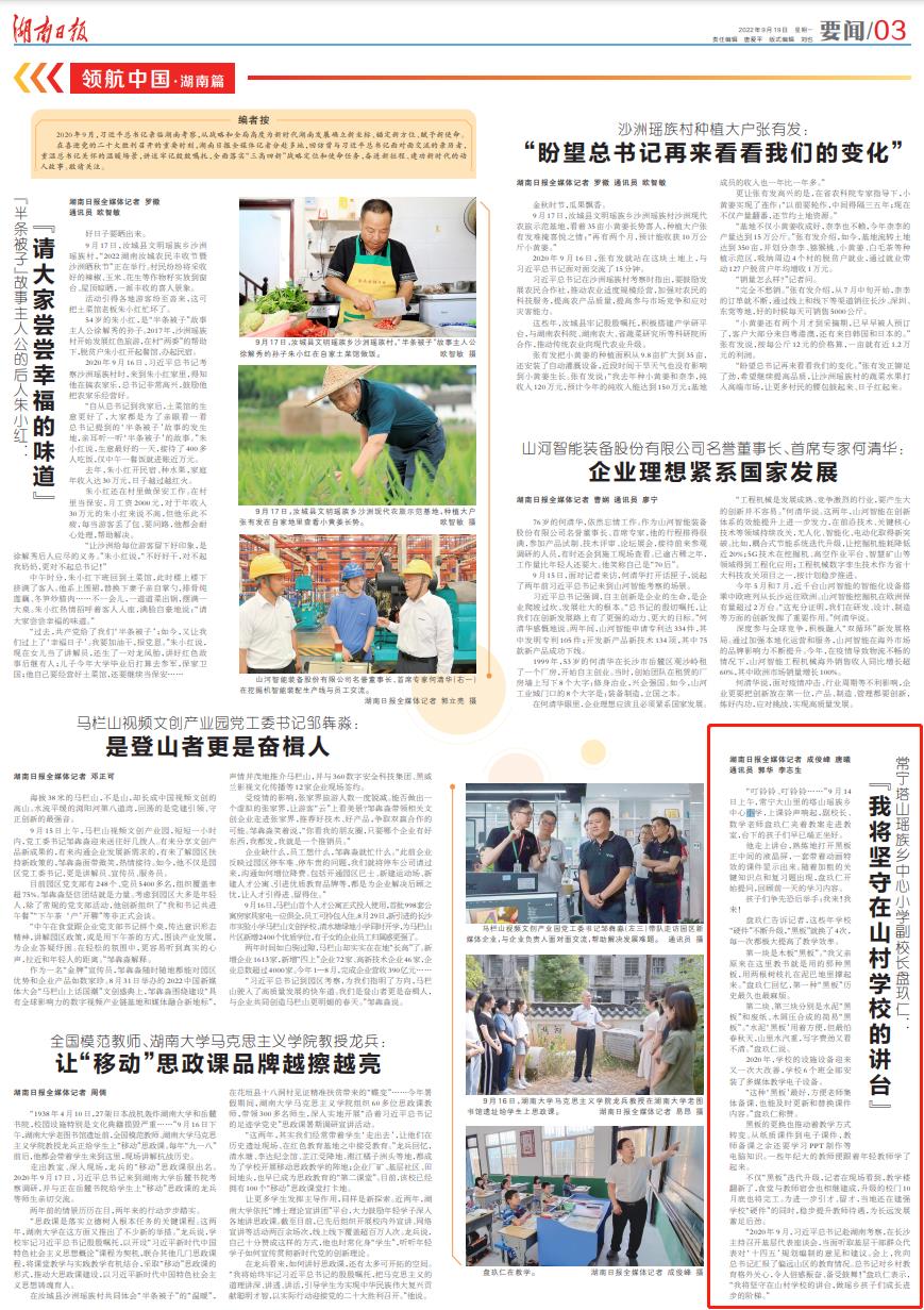 2020年9月,习近平总书记亲临湖南考察,从战略和全局高度为新时代湖南发展确立新坐标、锚定新方位、赋予新使命。在喜迎党的二十大胜利召开的重要时刻,湖南日报全媒体记者分赴多地,回访曾与习近平总书记面对面交流的亲历者,重温总书记关怀的温暖场景,讲述牢记殷殷嘱托,全面落实“三高四新”战略定位和使命任务,奋进新征程、建功新时代的动人故事。敬请关注