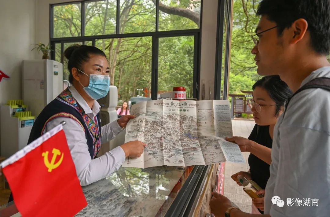 9月14日,张家界武陵源风景区咨询台党员示范岗,欧华在为游客提供旅游咨询服务。今年42岁的她,日常工作就是为游客指路、规划游玩线路、应急救助、送凉茶等。