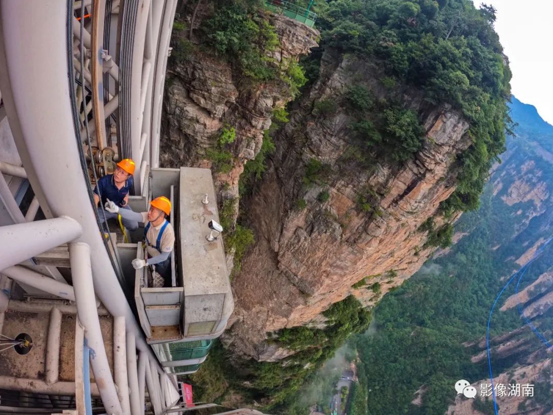 9月13日,张家界武陵源风景区百龙天梯,电梯巡检工刘杰(右)、廖再强对电梯缆绳进行检查。当游客乘坐这部垂直高差355米的悬崖户外电梯在峰林间上下穿行时,电梯巡检工在电梯的钢架或吊厢上反复对缆绳、吊厢进行现场巡检,排除一切可能存在的安全隐患。