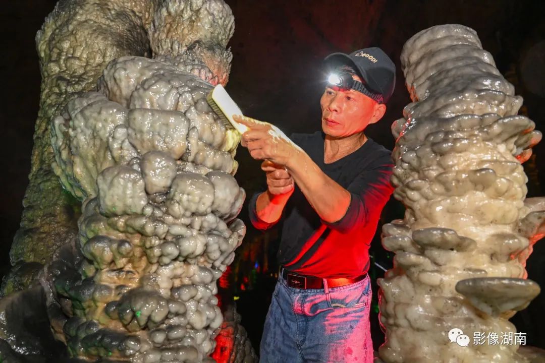 9月13日,张家界黄龙洞景区,保洁工毛国平在清洗钟乳石。20年来,他坚守在阴冷潮湿的溶洞里清洗钟乳石,只为给游客呈现最美的自然景观。