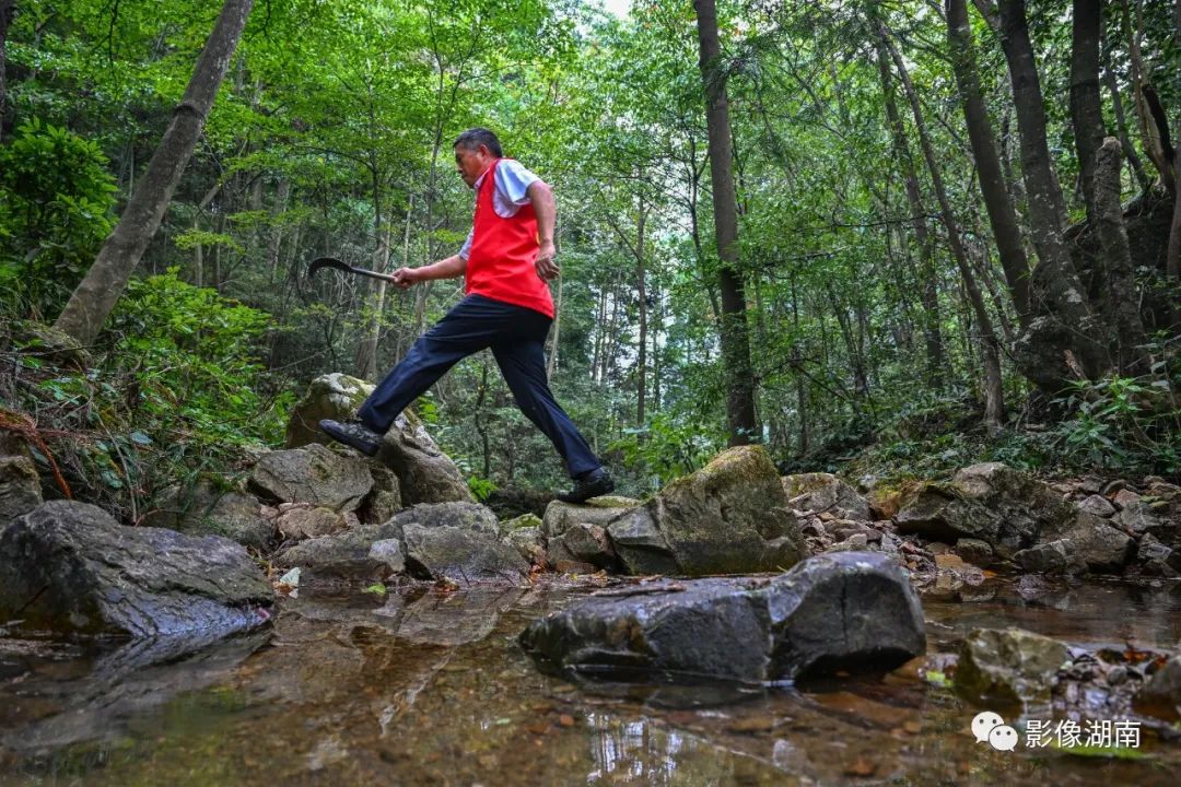 9月14日,张家界国家森林公园花溪裕护林点,护林员彭仕文在徒步巡查。30年来,他就像森林中的“隐形人”,与大山为伍,与森林为伴,用脚步丈量着山林。
