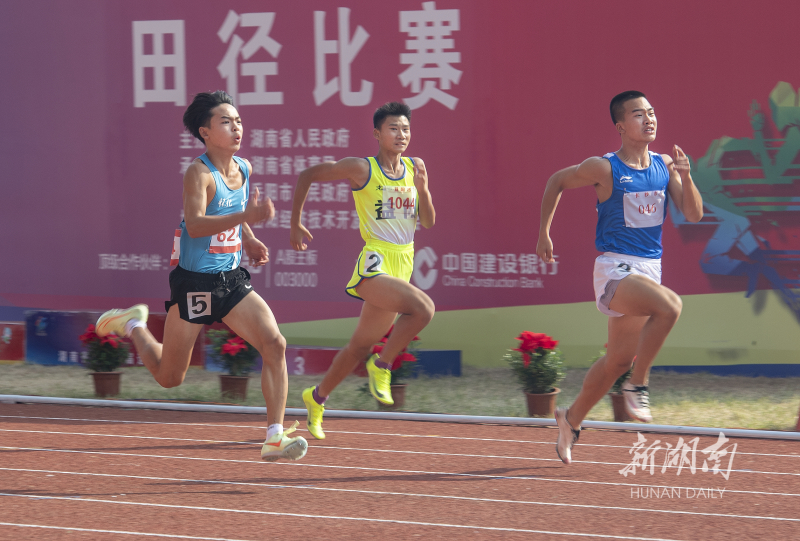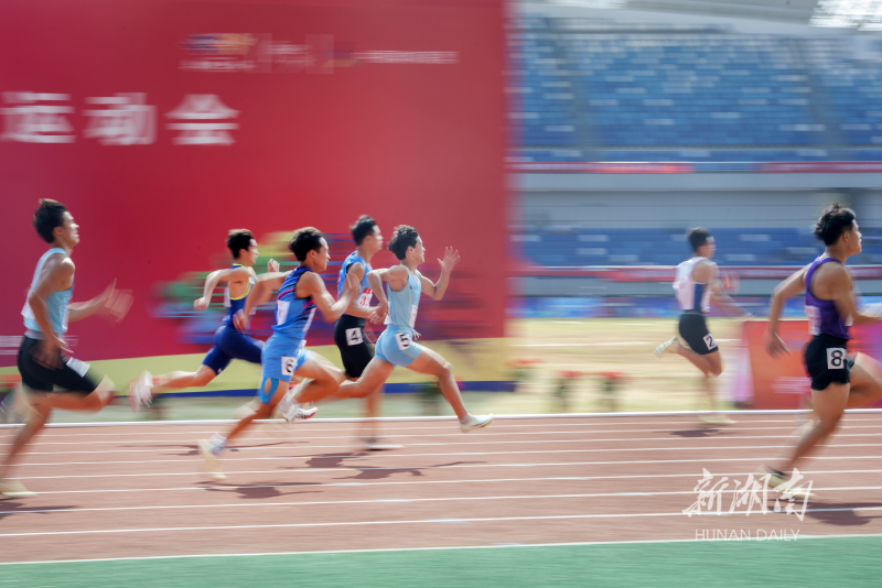 9月15日上午,运动员在进行男子100米比赛。当天,省第十四届运动会(青少年组)田径比赛在岳阳市体育中心体育场开赛,分别进行了男子100米、女子100米、跳远及铅球项目的激烈角逐。全部(青少年组)田径比赛将持续至9月18日。 湖南日报全媒体记者 李健 摄