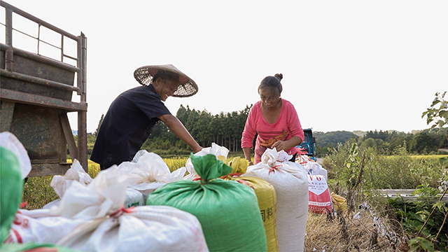 金秋的稻香画卷,是对耕耘的致敬,对收获的礼赞。连山乡连山村的村民们满脸笑容,将刚收的稻谷捆扎好袋口,准备装车。 胡江勇 摄