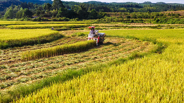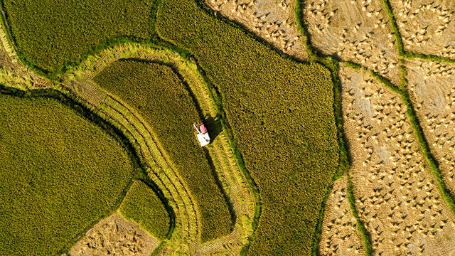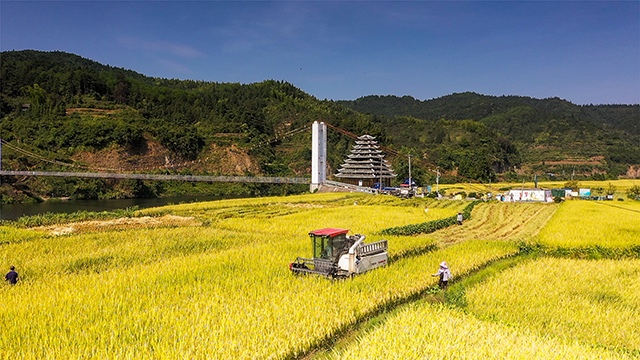 春种夏耘,秋收冬藏。在希望的田野上,每一滴汗水都见证着农民的辛劳,青朗侗族苗族乡客寨溪村,蓝天下,收割机徜徉在金黄的稻谷中,正唱响一首乡村振兴进行曲。张镭 摄