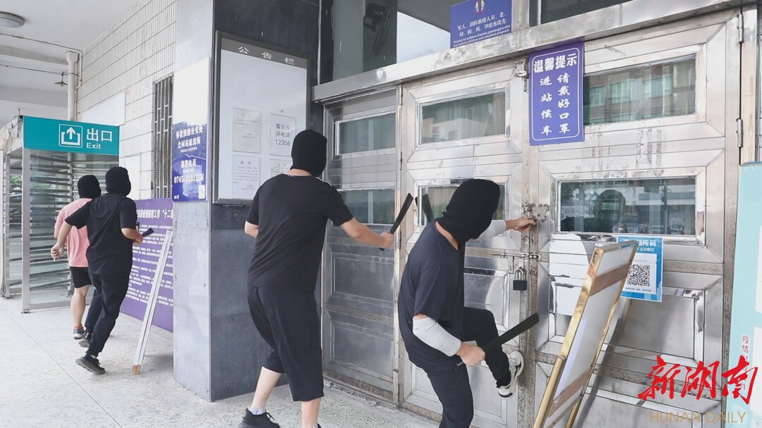 此次演练假设情景为:会同火车站广场“5名恐怖分子”手持砍刀,在车站出站口前对出站旅客行凶。部分旅客受伤受惊,跑入候车室向车站工作人员报告并报警。车站派出所值班民警,在40秒之内立即组织最小作战单元,赶赴现场进行初期处置,并立即使用对讲机向会同县公安局指挥中心汇报,请求警力支援。