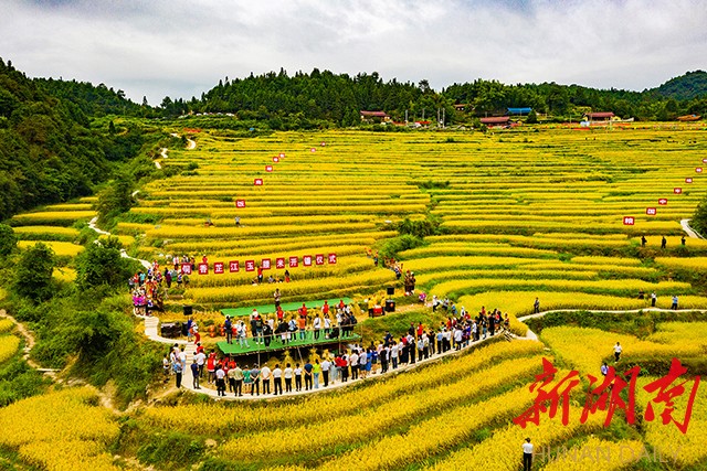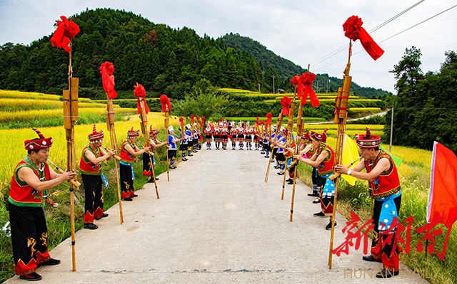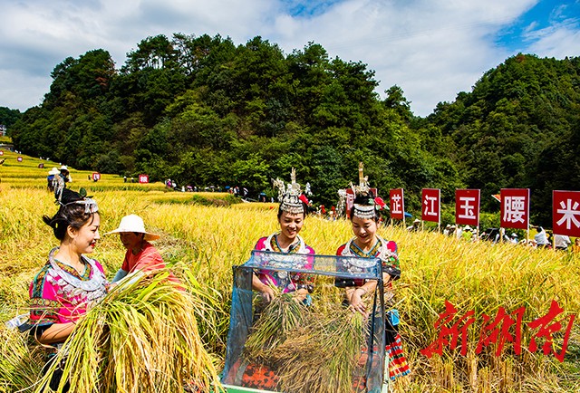 湖南日报·新湖南客户端9月3日讯(记者 雷鸿涛 通讯员 田文国)9月2日,芷江侗族自治县牛牯坪乡千丘田300多亩梯田稻浪滚滚,一片金黄。伴随着阵阵芦笙,中国农民丰收节暨侗香芷江玉腰米基地开镰仪式在这里拉开帷幕。身着侗族服饰的村民吹起芦笙,擂响大鼓,唱起耶歌,与游客庆祝节日,分享丰收的喜悦。