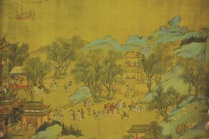 纵观这一时期的风俗画,可以分为两类。一类是表现市民文化生活的,可称为市井风俗画,包括描写城市社会生活的《清明上河图》,描绘节气社庆的《金明池正标图》《龙舟竞技图》等,描绘城乡贸易、市民行当、生活情趣的《货郎图》《眼药酸》《婴戏图》等。《清明上河图》以长卷形式表现了北宋首都汴京(今河南开封)及汴河两岸的自然风光和繁华街景。画卷以散点透视方式构图,以兼工带写法,描绘了当时的城市面貌、社会生活与市民文化,设色淡雅,人物众多,信息量丰富,具有极高的历史价值和艺术价值。这一图像在明清也极为受欢迎,成为职业画家的临仿对象。《货郎图》也是经典的风俗画题材,要么表现走街串巷、往来于城乡间的卖货郎,往往挑一个货架,架上有各类物品,周围有孩童环绕,这类货郎通常还兼代写文书、占卜卖药等角色,宋代李嵩的《货郎图》即是这类作品;还有一类表现的是宫廷人物模拟或者扮演民间货郎,这类图像明清更为盛行,人物衣着往往更为华丽,货物不多,但都精致讲究。货郎图往往会成组描绘,一般是春夏秋冬四季,从配景的花木及售卖货物可以得见。此次展览中的明代的《夏景货郎图》(故宫博物院藏)就是此类画作。