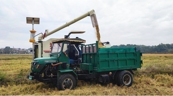 哗哗哗——一台满载而归的收割机停靠在田间地头,把脱粒的稻谷一股脑儿倒入转运车的车斗里。