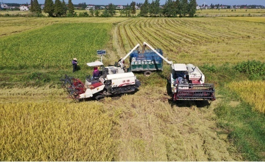 金灿灿的稻田连成一片,铺在蓝天之下、房舍与远山之间。空气中满是稻谷的清香。一台台联合收割机在“金色海洋”中往来穿梭,发出阵阵轰鸣声,奏响丰收的乐章。