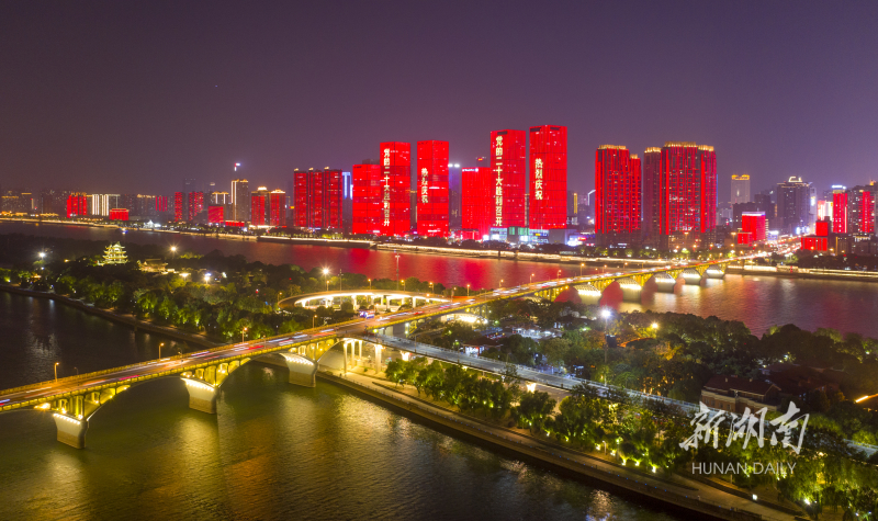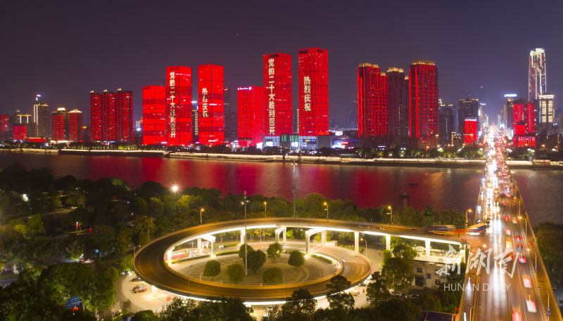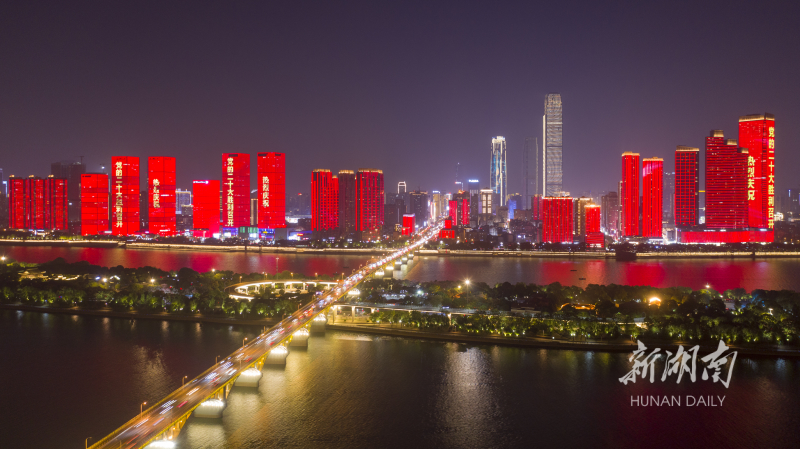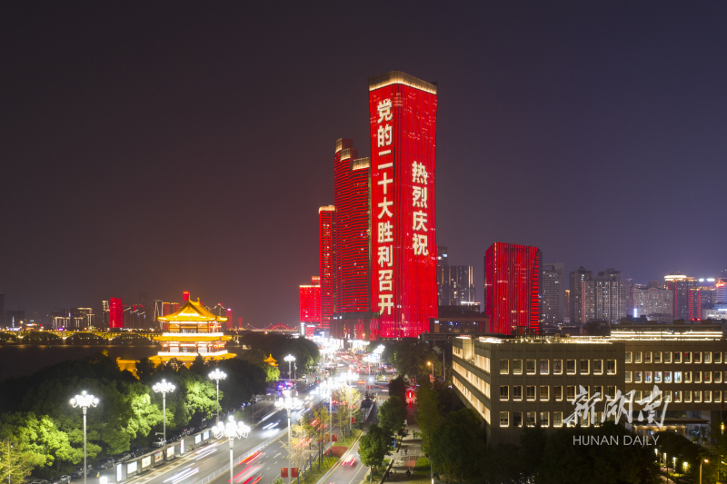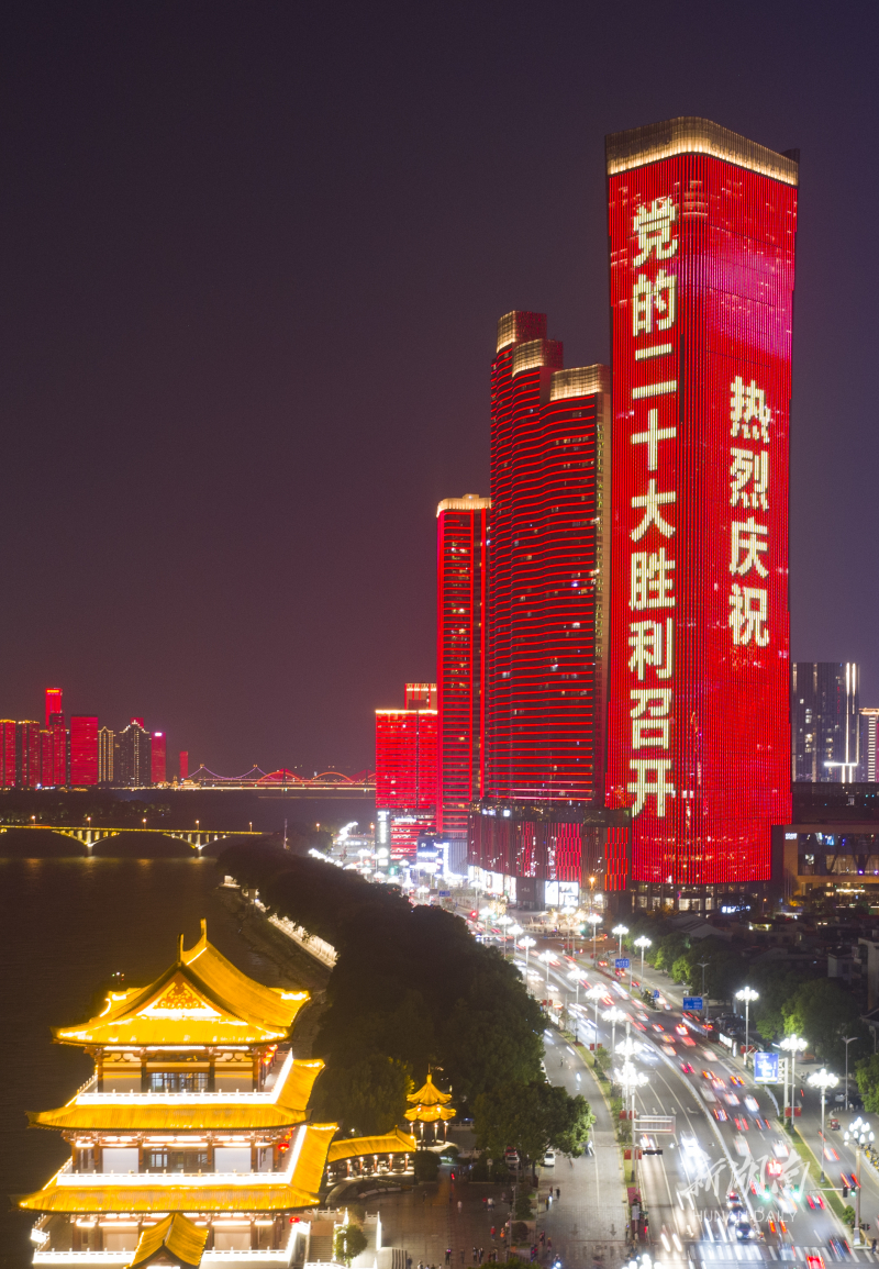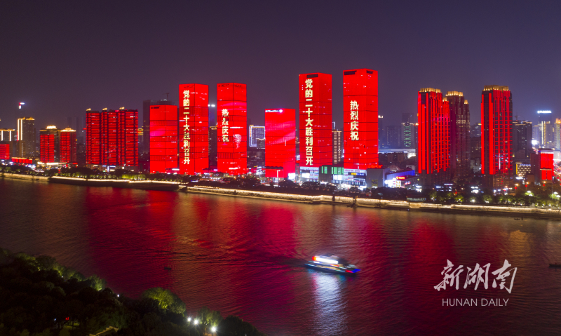 10月16日晚,长沙湘江两岸多个地标建筑灯光展示出“热烈庆祝党的二十大胜利召开”的字样,营造出浓厚的盛会氛围。 湖南日报全媒体记者 辜鹏博 摄