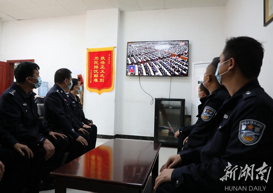 保靖县公安局清水坪派出所民警在收看党的二十大开幕会盛况。 俞采华 张昌峰 摄影报道