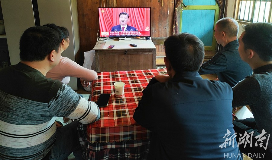 资兴市州门司镇黄旗洞村,村干部和村民在收看党的二十大开幕会盛况。陈雄鹰 摄