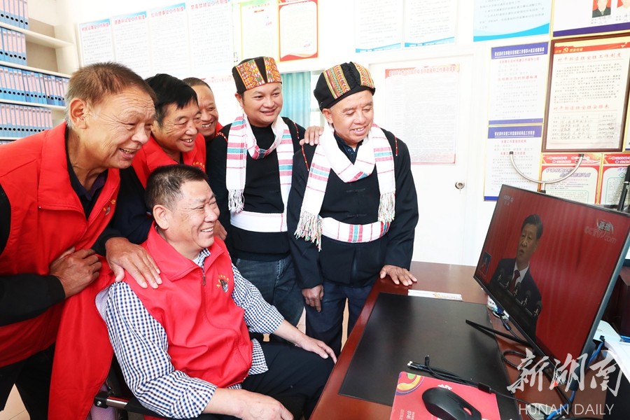 宁远县九疑山瑶族乡盘江湾易地扶贫搬迁集中安置点,瑶胞在收看党的二十大开幕会盛况。郑明辉 蒋克青 摄影报道