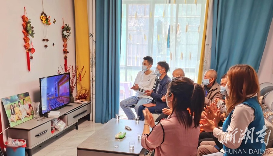 岳阳楼区张超民兵先锋连成员在英模张超父母家中一同收看党的二十大开幕会盛况。尹萍 任可 摄影报道
