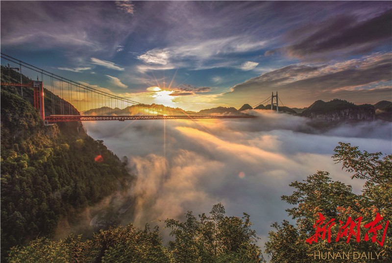 一座大桥连接东西,接连幸福。精准扶贫首倡地十八洞村,矮寨不矮时代标高的矮寨大桥,湘川公路建设精神……新时代红色地标人气高涨,吸引家庭游、团队研学纷至沓来。
