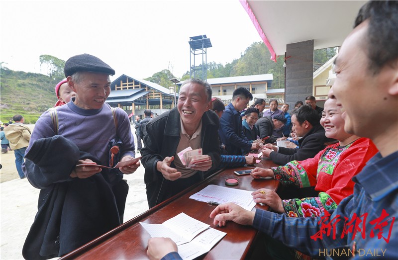 十八洞村民喜领猕猴桃产业分红金。 龙艾青 摄