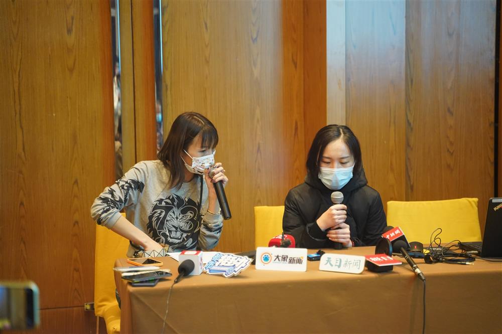 2月16日晚,二审第一次开庭后刘暖曦一方举行的媒体见面会现场,刘暖曦(右)发言。 王倩 摄