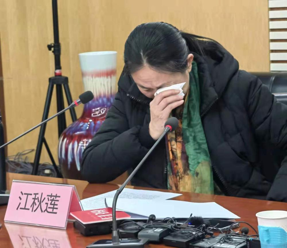 一审判决后,2022年1月11日媒体座谈会上,江秋莲偶尔忍不住落泪。 朱健勇 摄