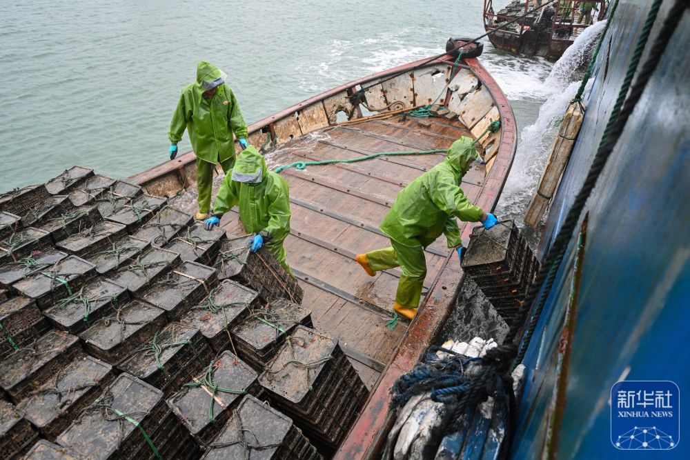 当日,福建福州连江县苔菉镇后湾海域热闹非凡,5万多笼鲍鱼从山东荣成乘船归来,返回家乡过冬。