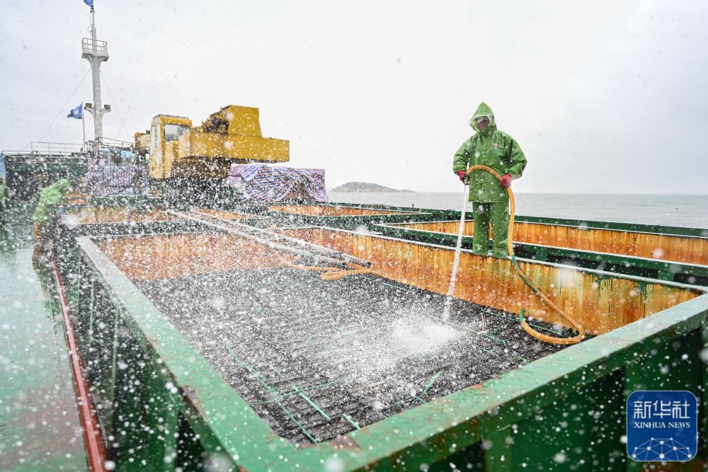 11月25日,在福州连江县苔菉镇后湾海域,渔民在运输船上冲洗鲍鱼养殖箱。
