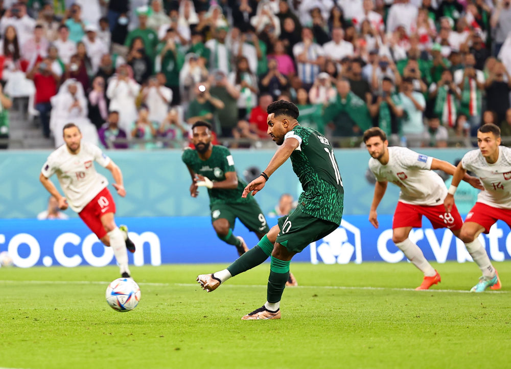 ↑沙特阿拉伯队球员萨勒姆-达瓦萨里(中)主罚点球。新华社记者 丁旭 摄