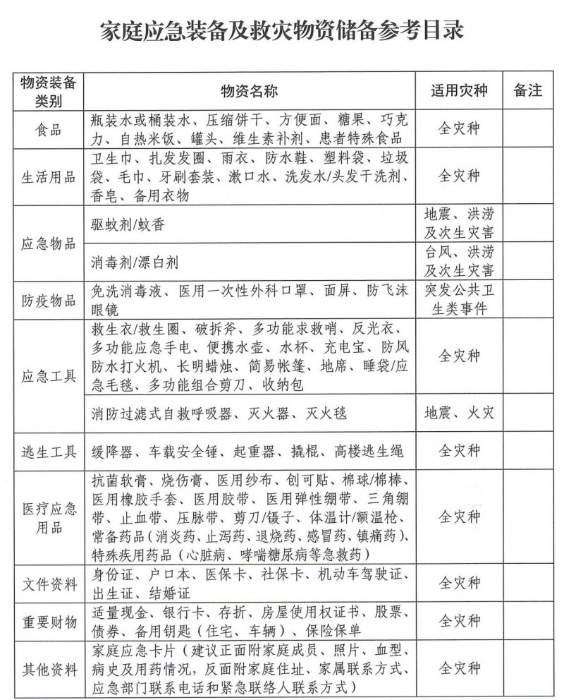 记者注意到,《意见》附件中涵盖了区县(市)、乡镇、村(社区)和家庭应急装备及救灾物资储备参考目录。其中,在家庭应急装备及救灾物资储备参考目录中,有瓶装水或桶装水、压缩饼干、方便面、自热米饭等食品,卫生巾、雨衣、防水鞋、塑料袋、洗发水/头发干洗剂、香皂、备用衣物等生活用品,驱蚊器/蚊香、消毒剂/漂白剂等应急物品,免洗消毒液、医用一次性外科口罩等防疫物品,破拆斧、多功能求救哨、多功能应急手电、便携水壶、充电宝、防风防水打火机、简易帐篷、睡袋/应急毛毯、多功能组合剪刀、收纳包、消防过滤式自救呼吸器、灭火器、灭火毯等应急工具,车载安全锤、高楼逃生绳等逃生工具,抗菌软膏、烧伤膏、医用纱布、创可贴、棉球/棉棒、医用弹性绷带、三角绷带、体温计/额温枪、常备药品(消炎药、止泻药、退烧药、感冒药、镇痛药)、 特殊疾用药品(心脏病、哮喘糖尿病等急救药)等医疗应急用品,身份证、户口本、社保卡、机动车驾驶证、结婚证等文件资料,适量现金、银行卡、存折、备用钥匙(住宅、车辆)等重要财物和家庭应急卡片等其他资料。