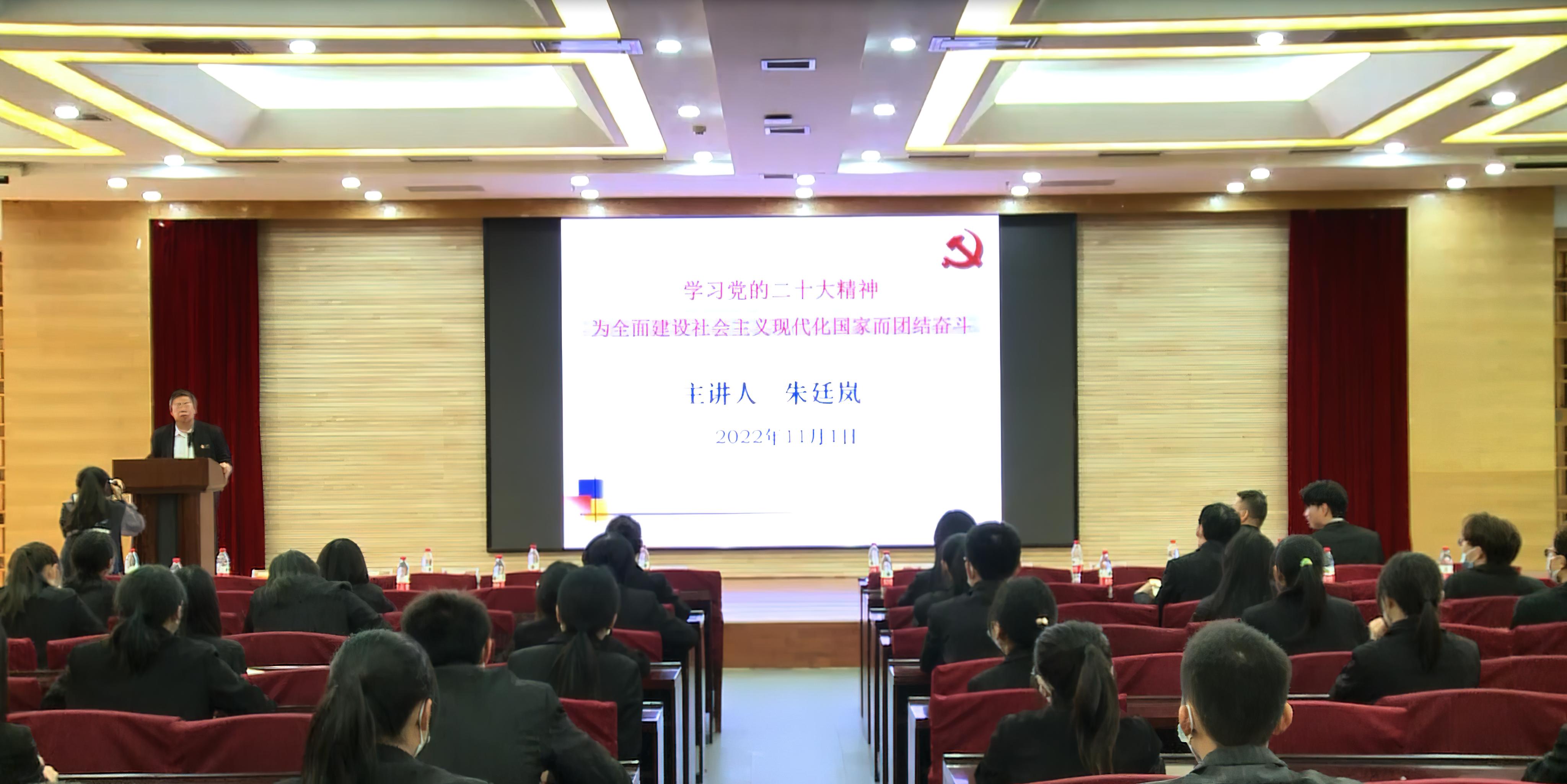 吉首大学张家界学院马克思主义学院院长朱廷岚带领大家重温了党的二十大盛会概况,解读了二十大报告主要内容以及学习贯彻党的二十大精神的要求,引导参会学生为全面建设社会主义现代化国家、全面推进中华民族伟大复兴而团结奋斗。
