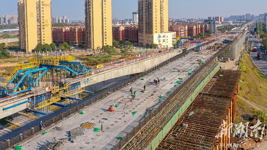 11月7日,建设者在长沙地铁1号北延线金盆丘站至金霞站高架区间加紧施工。目前,长沙地铁1号北延线金盆丘站至金霞站高架区间桥梁已实现全贯通,全线车站主体已全部封顶,各车站进行附属工程施工。湖南日报全媒体记者 郭立亮 摄