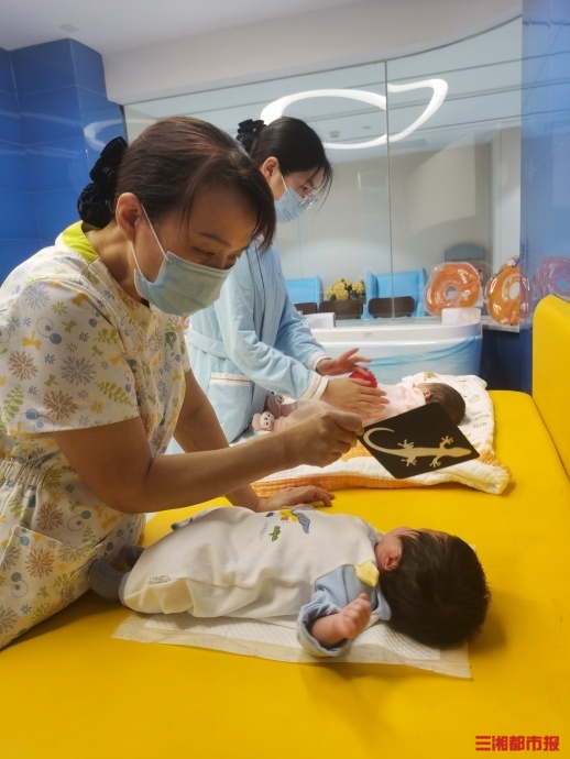 (月子中心工作人员正在训练婴儿的视觉追踪和聚焦的能力。受访者 供图)