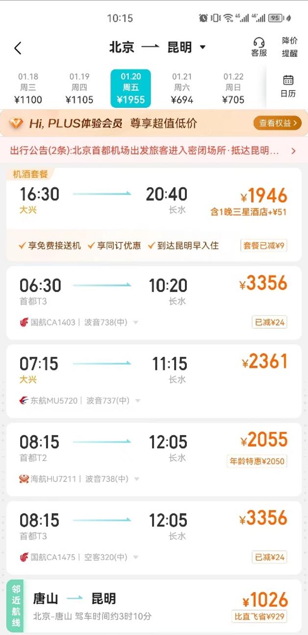 但大盘没涨,不代表热门航线的票价没涨。查询订票平台显示,春运期间从北京、上海、杭州等城市飞往三亚、昆明等旅游城市的经济舱机票,已接近全价。