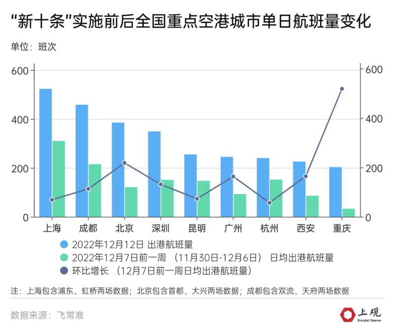 以疫情前全国机场客运吞吐量最高的上海、北京、广州、成都、深圳、昆明、西安、重庆等9个城市为例,12月12日9个城市的出港航班量均迎来大幅增长。
