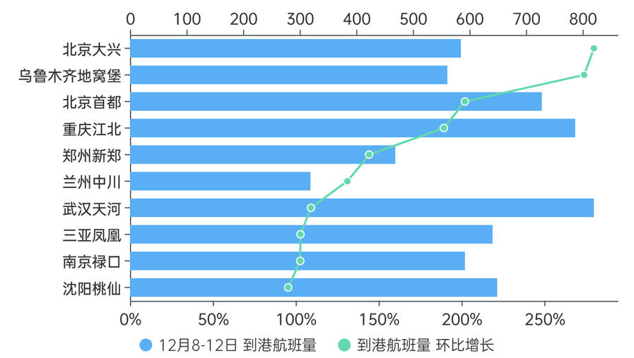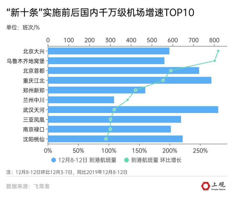 数据显示,到港航班量增长最快的城市分别是北京、乌鲁木齐、重庆、郑州、兰州、武汉、三亚、南京和沈阳。排名最靠前的城市,几乎都是此前疫情较为严重、较多区域封控的地区。除此以外,像三亚这样的旅游城市也在迅速恢复。