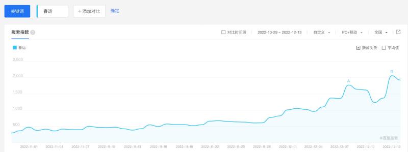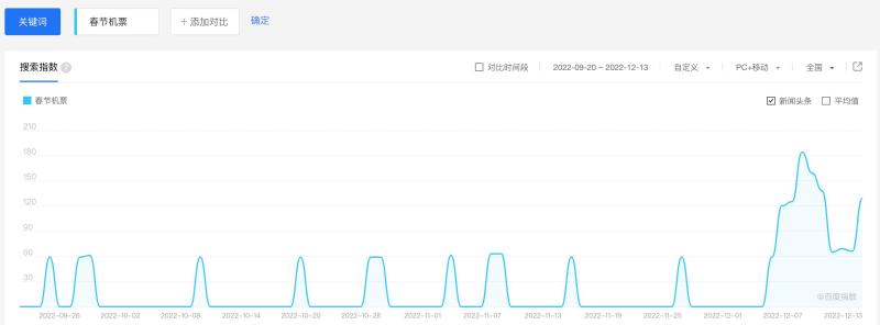 随着春节临近,“春节机票”和“春运”等关键词在12月5日至12月13日在搜索引擎的搜索量达到高峰。