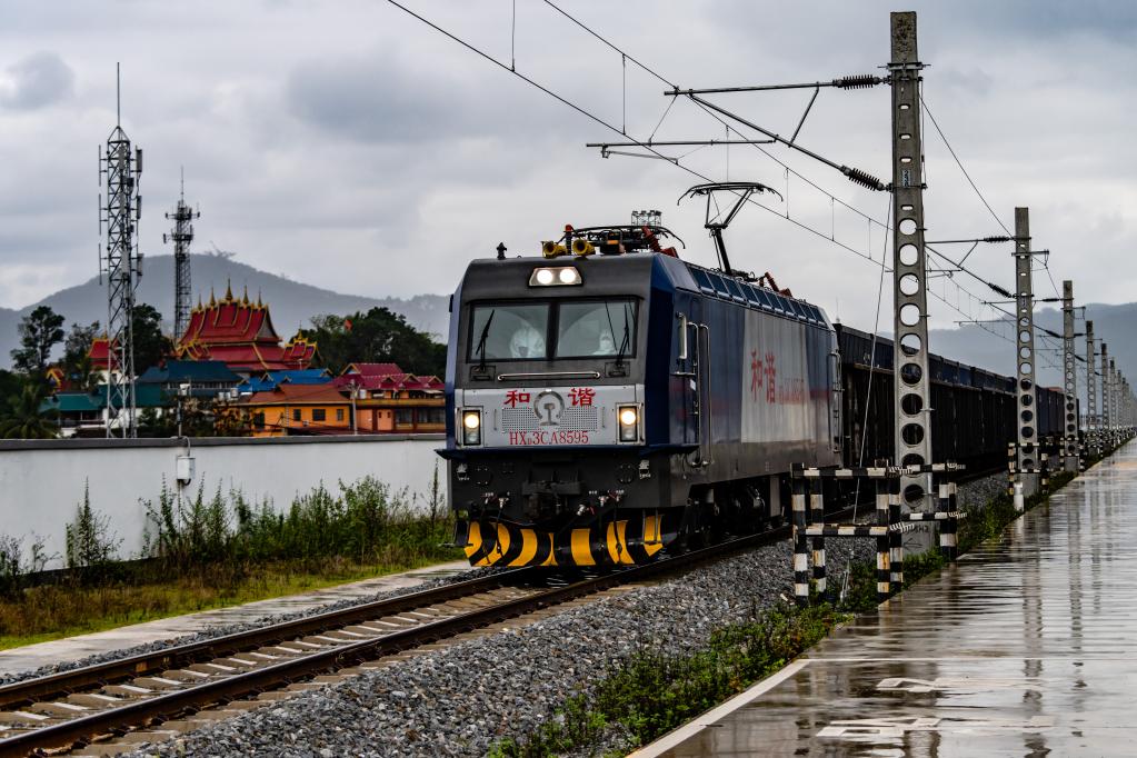 11月24日,货物列车即将驶入位于中老边境的友谊隧道。(新华社记者胡超摄)