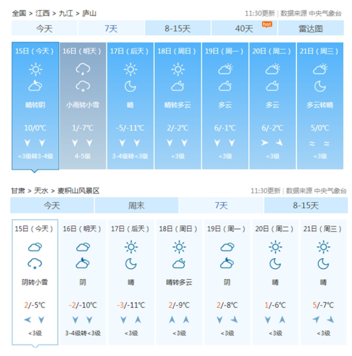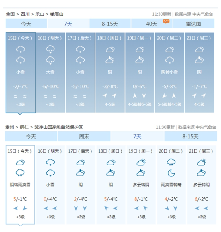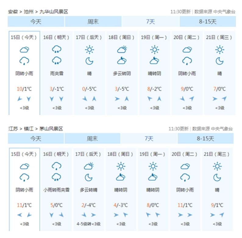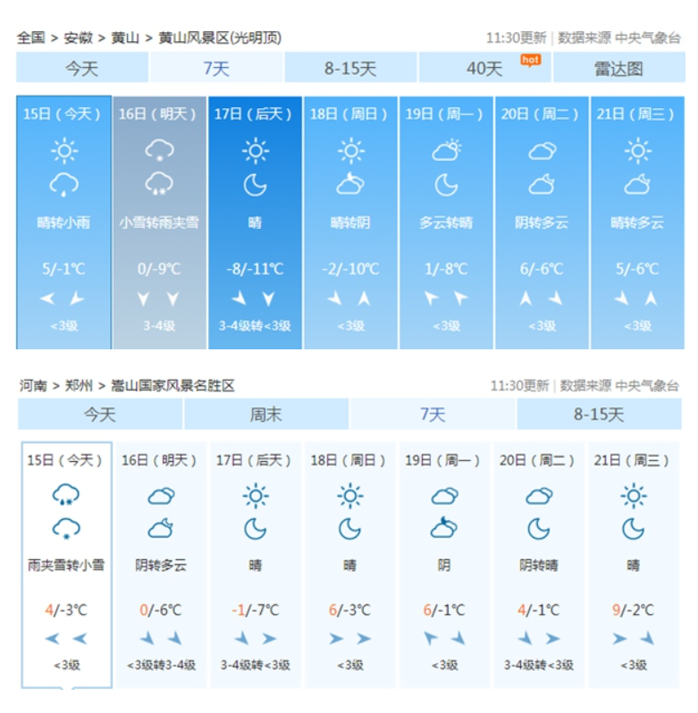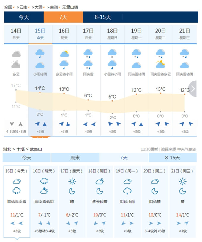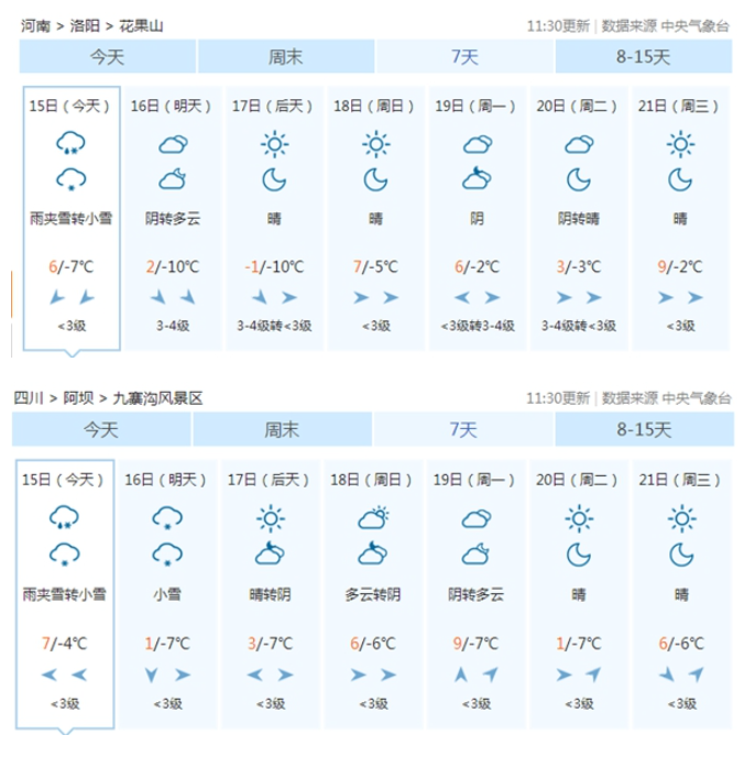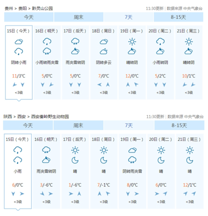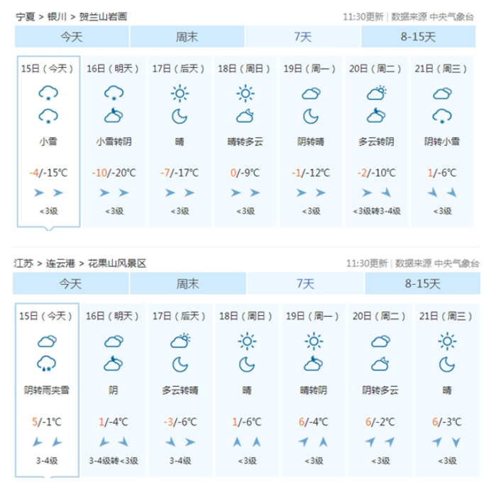此次冷空气带来的雨雪天气整体较弱。预计15-17日,西北地区东部、内蒙古西部、山东半岛、苏皖北部、河南东部、湖北北部、湖南西北部、贵州、川西高原、云南北部等地将出现小到中雪或雨夹雪,川西高原南部、山东半岛北部局地有大到暴雪;贵州西部局地有冻雨。15-16日,福建东部和广东东部等地的部分地区有中雨。