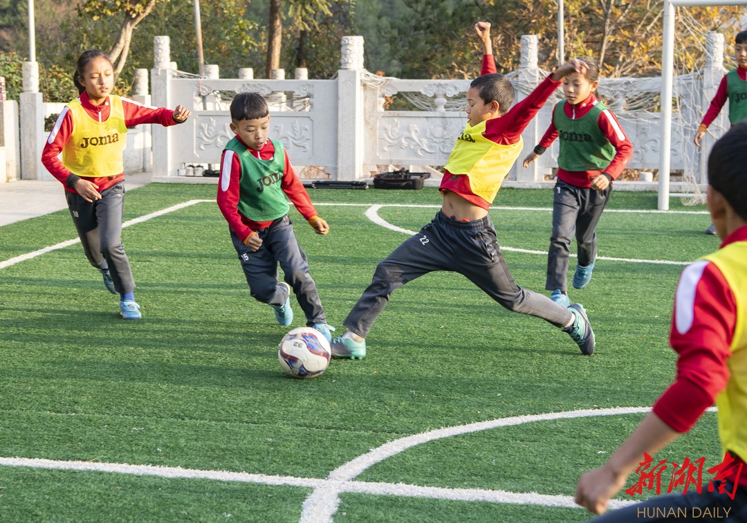 传球、带球、过人、射门,“球进啦!”一阵欢呼声从球场上传开。12月13日,湘乡市壶天镇湖南湘成足球俱乐部训练基地,一群来自四川大凉山的彝族孩子正在进行一场四人制实战对抗赛。