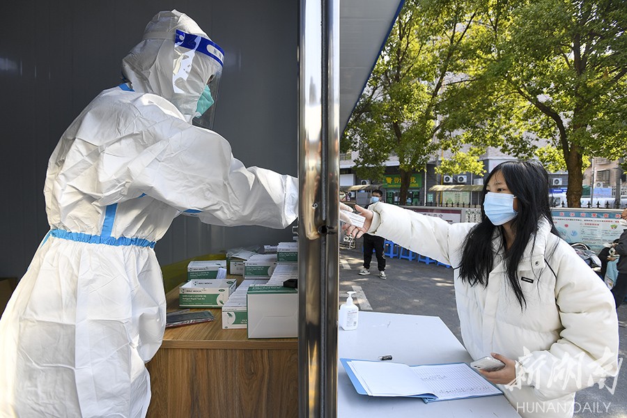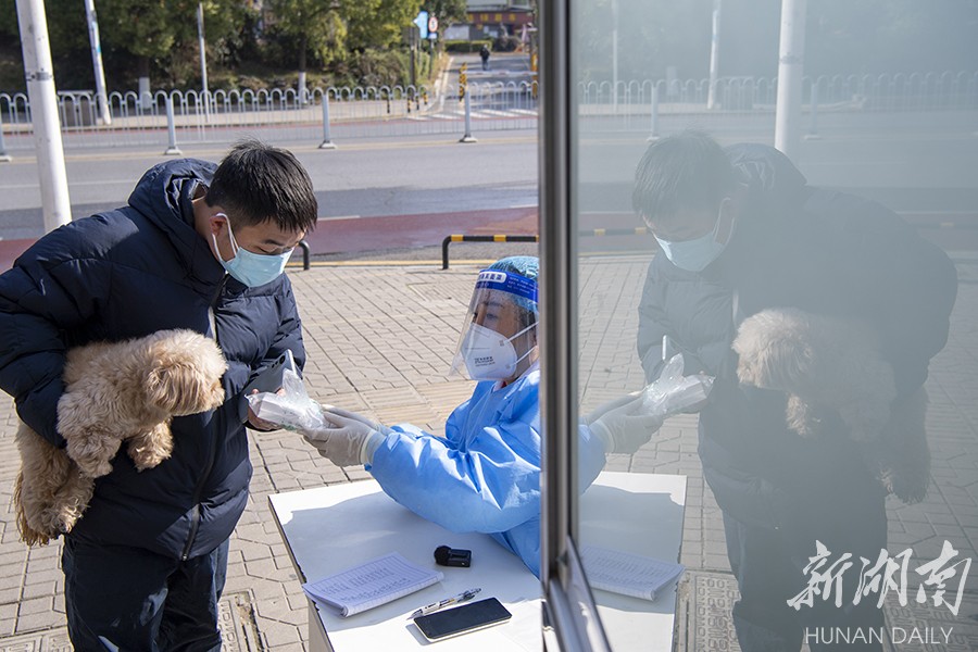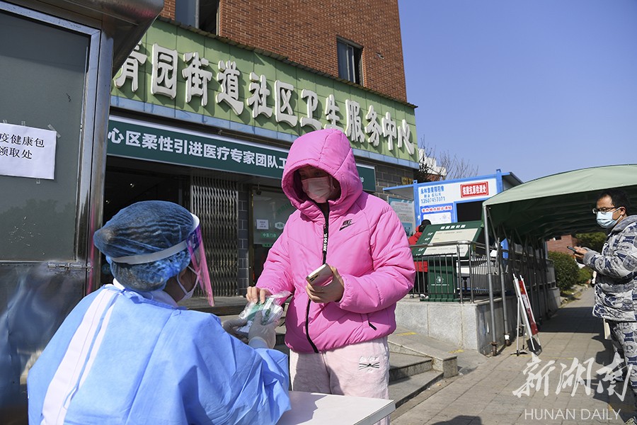 12月23日,湖南湘江新区望岳街道社区卫生服务中心,市民领取防疫健康包。当天,长沙在各个街道社区卫生服务中心面向核酸检测或抗原检测结果为阳性的市民免费发放防疫健康包。每份防疫健康包中包含退热药9片、抗原检测试剂2个,首批向市民免费发放的防疫健康包总数量约10万份。湖南日报全媒体记者 辜鹏博 摄