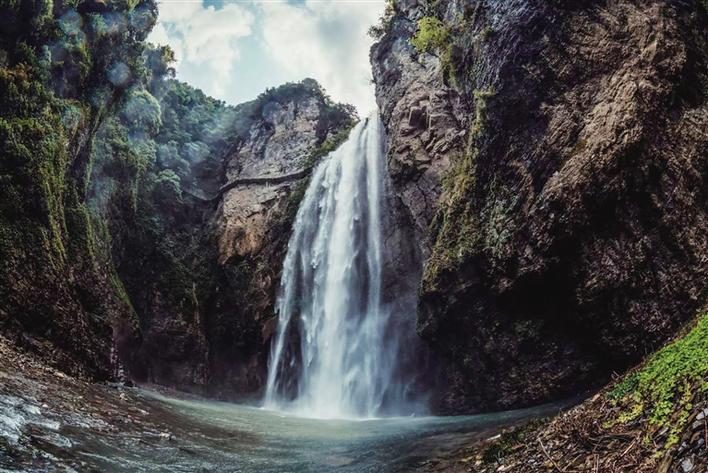最令人震撼的当属位于谷尾的飞水谷瀑布了,流水自百余米高坎凌空而下,如一匹巨大的白色布帘,夹杂着阵阵龙吟之声;又如九天银河跌落凡间,涛声轰轰,数里可闻。待到落底,一湾绿油油的潭水上,溅起几米来高的水花,风吹过,犹如下起阵阵毛毛雨,阳光照耀其上,幻化出一道俏丽的彩虹。