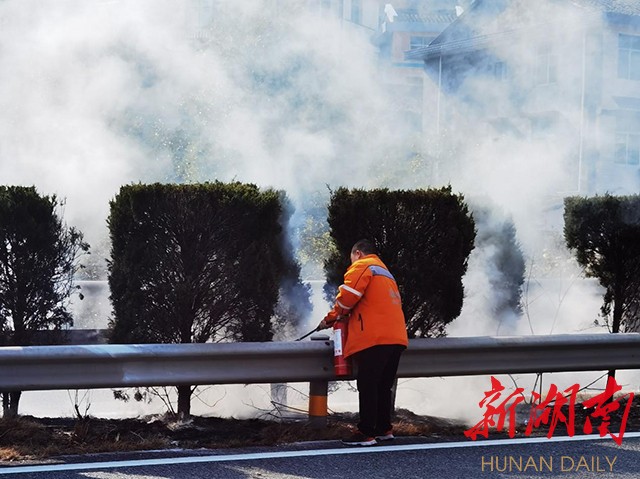 接到警情后,新晃管理所巡查人员迅速赶到现场,发现中央隔离带上正浓烟滚滚、火势凶猛,不时有车辆从旁驶过,情况十分危急。路管员立即靠边停车,与高速交警在来车方向设置警示区域,拉响警报提醒车辆减速慢行,并使用随车配备的灭火器等工具进行灭火。由于火势较大,灭火器只能暂时控制火势蔓延,不能彻底扑灭,好在消防部门及时赶到。经过15分钟的协同作战,明火终于被扑灭。为了预防火灾的再次发生,救援人员对起火点反复排查,确认无隐患后才离开现场。
