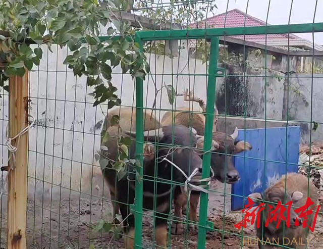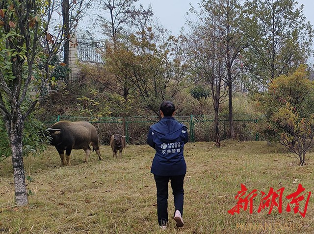 由于现场不时有车辆经过,水牛受到惊吓开始乱走,给驱赶工作带来困难。好在潘泓光有赶牛的经验,一边指挥其他工作人员引导车辆缓慢通行、不要鸣笛,一边模仿牛叫声安抚水牛情绪,缓慢靠近水牛,不一会儿就牵住了领头的公牛,成功将牛群引导至收费站院子里。随后,工作人员临时搭了个简易牛棚,还割来鲜嫩的青草,这“一家三口”算了暂时安顿下来。