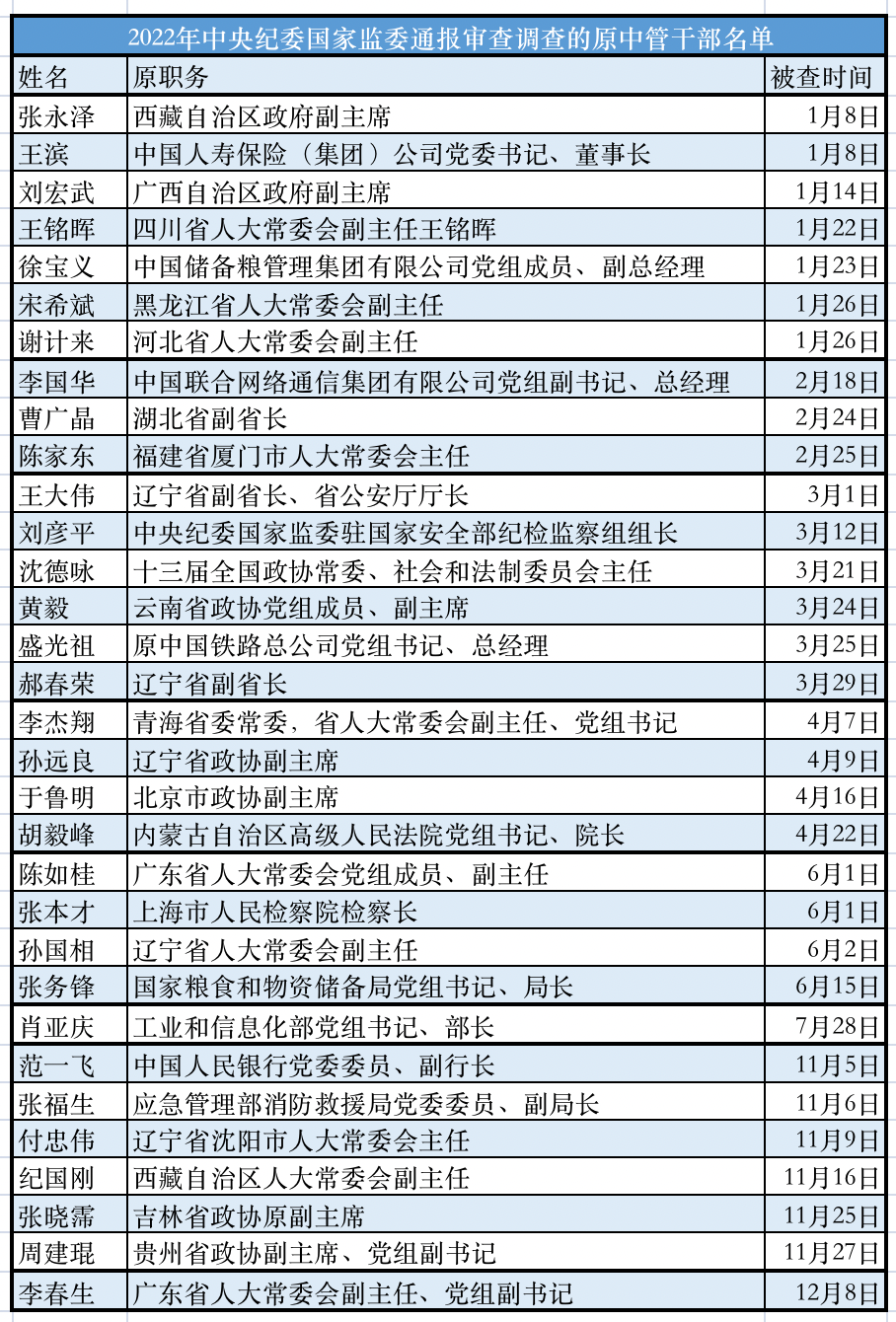 根据中央纪委国家监委网站的通报,2022年全年共有32名中管干部被查,这一数字为近年来最高。这一年里,共有3个月中被查的中管干部达到或超过6人,其中1月有7人,成为党的十九大以来落马“老虎”最多的一个月,同时3月、11月也各有6人。