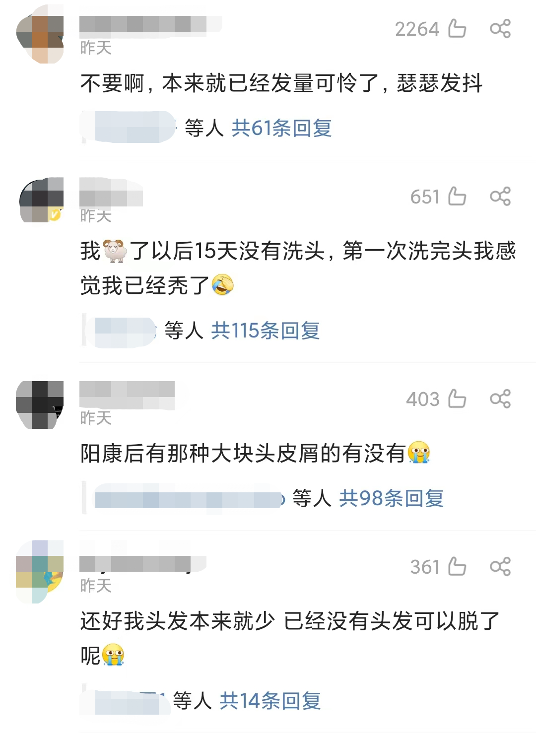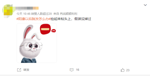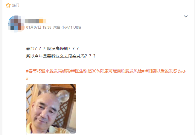 不少网友已经开始担心,春节的时候走亲访友怎么办?兔年难道要变“秃”年了?有人表示,自己头发本来发量就少,瑟瑟发抖。还有人表示,还好自己已经没有头发可以脱了。