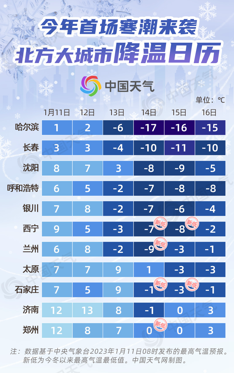 从中国天气网推出的大城市降温日历来看,13日开始,降温剧烈的城市主要集中在东北、黄淮、西北等地,像哈尔滨的最高气温将从2℃暴降至-17℃,石家庄、济南将从8至9℃跌至冰点之下,都是隔天如换季。